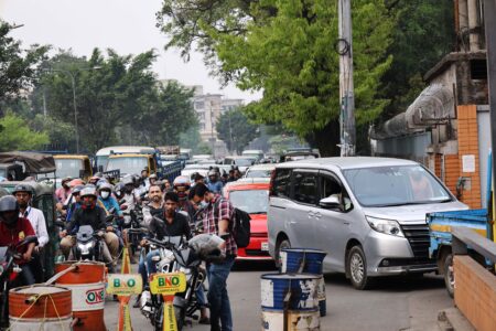Customers wait in line at a filling station in Dhaka, Bangladesh, on March 12, 2026. Image credit: Crux / Stephan Uttom Rozario