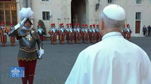 He met with the new recruits and their families on Friday, offering them a special reflection during an evening Vespers service, telling them, “The challenges your generation faces are numerous. They include environmental issues, economic change, social tensions, the digital revolution, artificial intelligence, and other complex realities that require discernment and a sense of responsibility.”